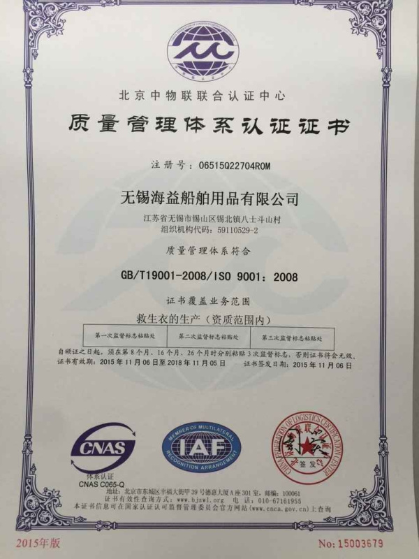 無錫海益船舶用品有限公司是船舶救生設備的專業生產企業,地處江蘇省無錫市,屬長江金三角腹地。主要生產氣脹式救生衣,三片式救生衣等各種救生設備,示位燈、信號設備、救生艇筏屬具及其它船舶配件。公司產品已越來越受世界各國用戶的青睞。